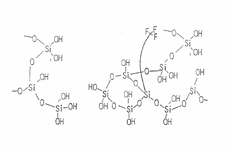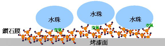 当喷涂于烤漆表面时,奈米硅溶胶与配方中之其他组成混杂堆栈于烤漆表面,当溶剂挥发后,硅溶胶自组装于烤漆表面,形成一硬度为2H~3H的薄膜,并于此薄膜上长出低表面能的奈米级纤毛。空气可包覆其中。水泼洒于其上时,由于水的表面张力,与界面的低表面能相斥,而聚成球状,又因其下含有空气垫,可将水珠顶住,形成接触角大于110度的漂亮水珠。