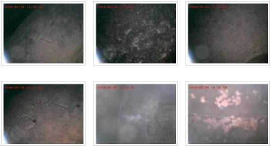 使用微型摄影机伸入汽缸拍摄,可以看见厚厚有油光之黑色积碳。